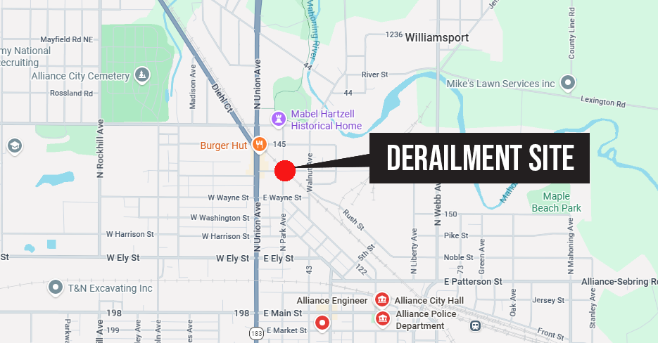 The train derailed near E. Keystone Road and N. Park Avenue along Alliance's north side.