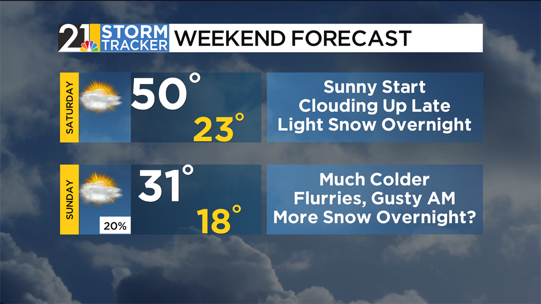 Flurries may linger into Sunday morning. Temperatures will be well departed from the mild fling to end the week, as highs will drop back down to the mid-30s.
