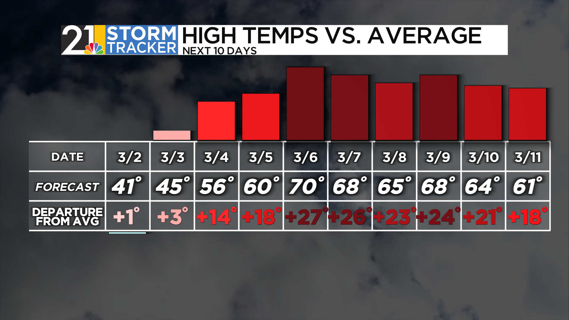 Thermometers will continue to pick up day by day as we go through the week. Highs on Wednesday will again improve to the mid-50s – about 15° above average. Showers are the expectation, especially on the outer thirds of the day, where dry conditions will be more possible around midday. Even more showers are likely overnight.
