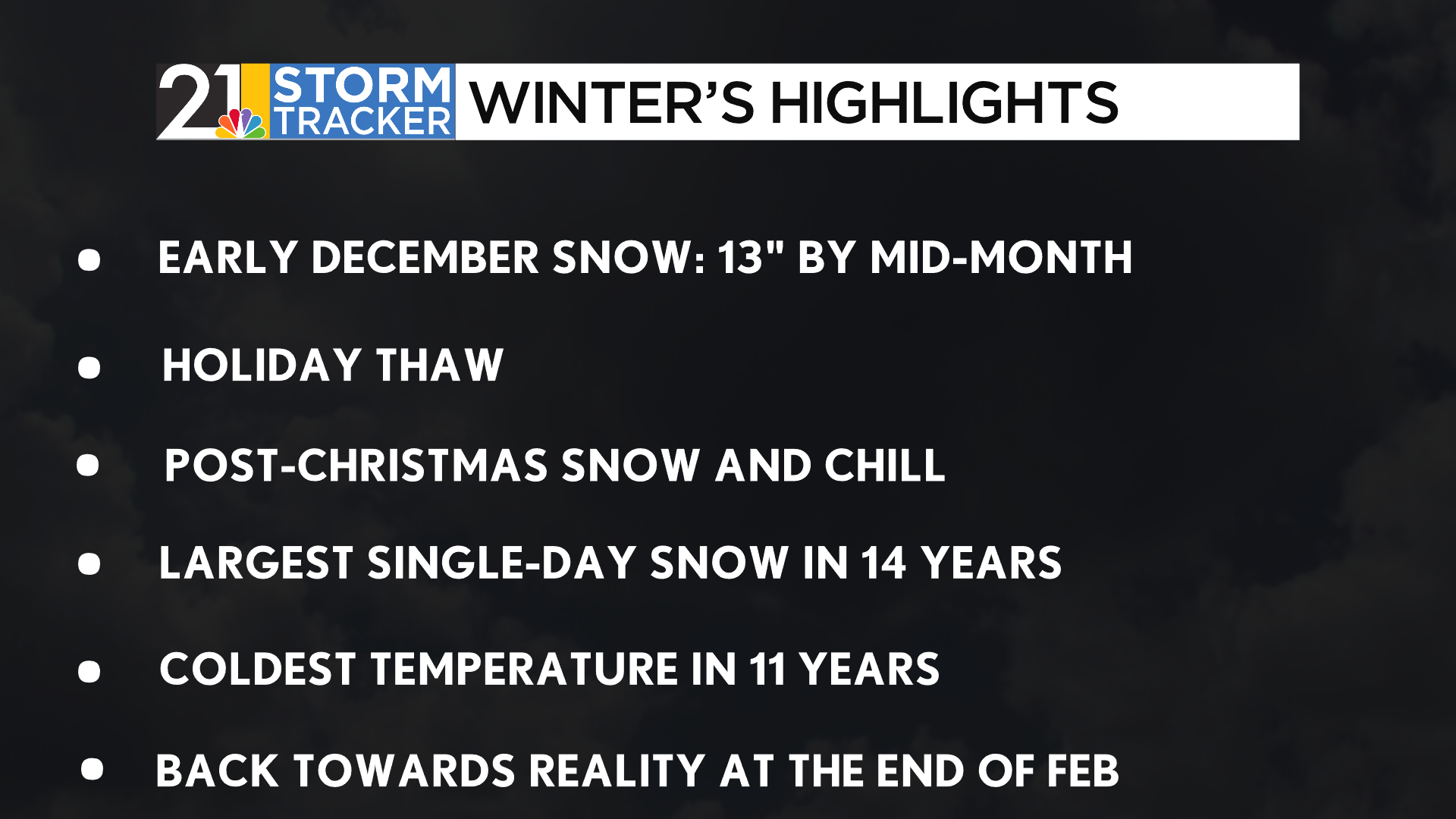 Meteorological winter got off to a jumpstart when a system moved in from the southeast, dropping just over 5 inches at the Youngstown-Warren Regional airport. More rounds of snow, plus some lake-effect flurries, got our yearly snowfall up to about 13 inches by the halfway point of the month. Sixteen straight days to open up the month featured an average temperature below average, allowing most of our precipitation events to result in snow. After this, temperatures perked up closer to the holidays. With a few days in the 50s before the 25th, the Valley failed to have a white Christmas. The month ended as it started, however, with a decent hit of snow right before the ball dropped into 2026.