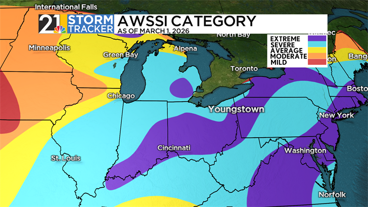 One index, the Accumulated Winter Season Severity Index (AWSSI), aims to objectively quantify the severity of local winters and compare it with other years. The index runs on a “point” system, with each point earned by the achievement of a specific variable or amount. These variables are the high temperature, low temperature, daily snowfall, and recorded snow depth. A season with a higher cumulative point total would be regarded as a more “severe” season. As of March 1, the Youngstown-Warren Regional Airport has accumulated 692 points, placing it just into “extreme” classification- more severe than 80% of past area winters in the index’s database.