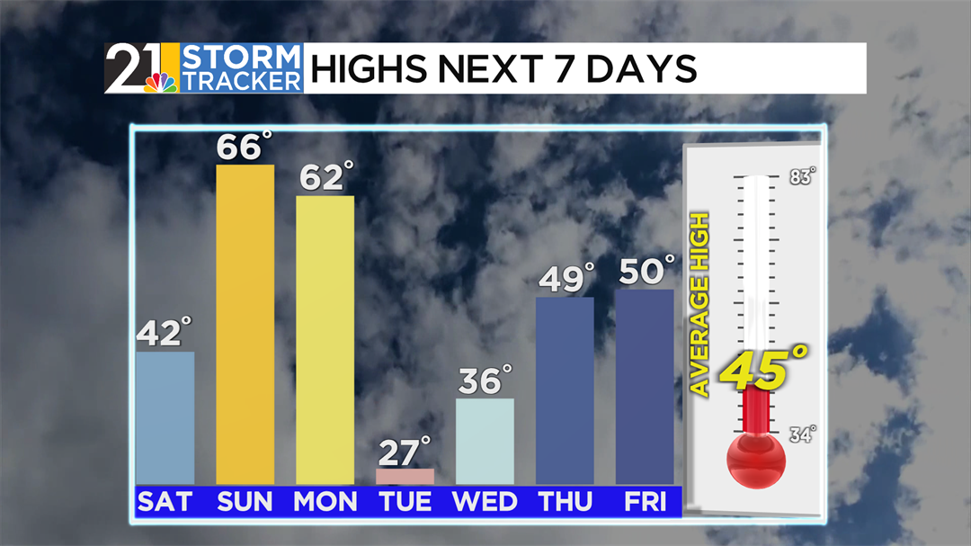 A big change is in the forecast for Monday. The day will start with warm air hanging on, but a powerful cold front is set to roll though Ohio and into Pennsylvania by midday. Temperatures will drop from the lower 60s to the lower 30s in a matter of hours. After some gusty midday showers, some wet snowflakes or flurries will become a possibility before the afternoon is through.