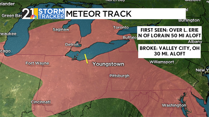 Viewers on the shores of Lake Erie got to experience the meteor first. It was first seen over Lake Erie north of Lorain, about 50 miles aloft. Over the next few seconds, the meteor traveled at 40,000 miles an hour through Earth's atmosphere and crossed over land west of Cleveland. The 6-foot, 7-ton meteor then progressed through the northern fringe of the state, moving over communities such as Elyria and Lagrange, just west of the Cleveland International Airport.